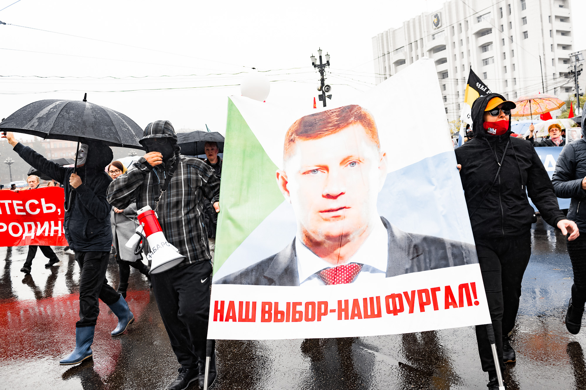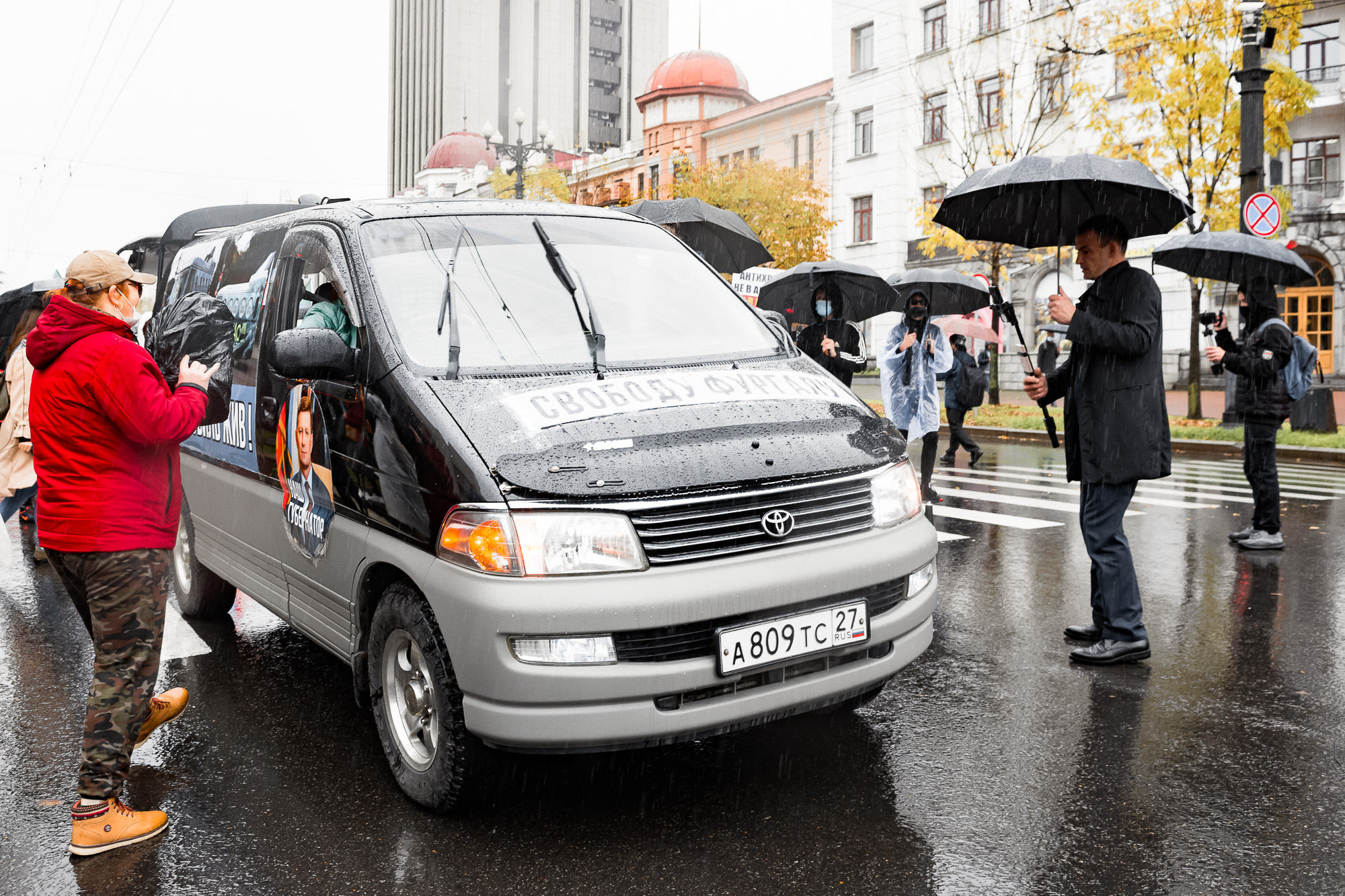 Между тем началось традиционное шествие. Предупреждения полиции не выходить на проезжую часть снова были проигнорированы, а на ул. Шеронова колонну митингующих возглавил Фургаломобиль 2.0. В этот раз, словно в отместку оглушающей классике на площади, в автомобиле установили мощные колонки, из которых транслировали народные песни в поддержку Фургала. Правда, из-за этого музыкального сопровождения почти не было слышно лозунгов. Хотя толпа все так же скандировала "Хабаровск выходи, Фургала поддержи", "Путин вор", "Дело сфабриковано", "Вова, выпей чаю, Хабаровск угощает". Но голоса не менее тысячи митингующих тонули в музыке, шуме дождя и сигналах проезжающих мимо авто.