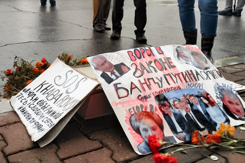 – Смотри, снимает! Да мы тебя все уже запомнили за два месяца! – со всей откровенностью говорили им окружающие. Между тем перед началом шествия протестующие решили соорудить нечто вроде "мемориала". "Банду Путина похороним и в шествие!" – пошутил кто-то. Люди уложили на тротуар перед крыльцом дома правительства несколько плакатов с портретами главных лиц страны, продажных, по мнению протестующих, судей и других чиновников. Здесь же оказались изображения лидера ЛДПР Владимира Жириновского и нынешнего врио губернатора Хабаровского края Михаила Дегтярева. Рядом бросили цветы.