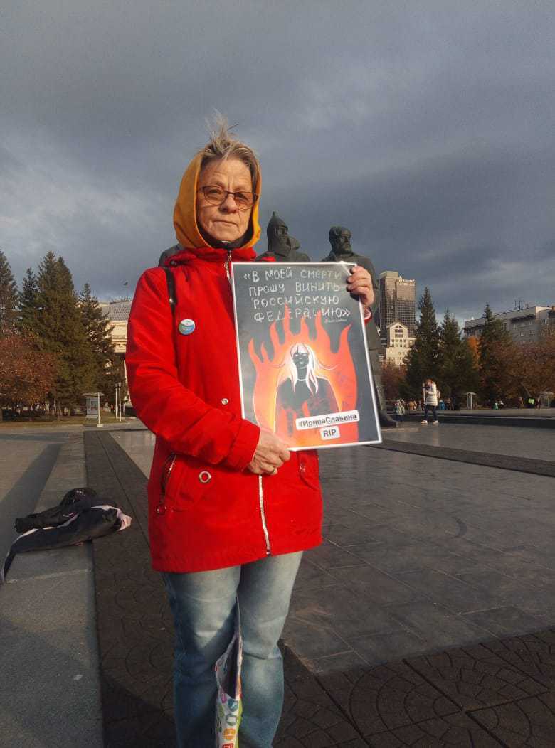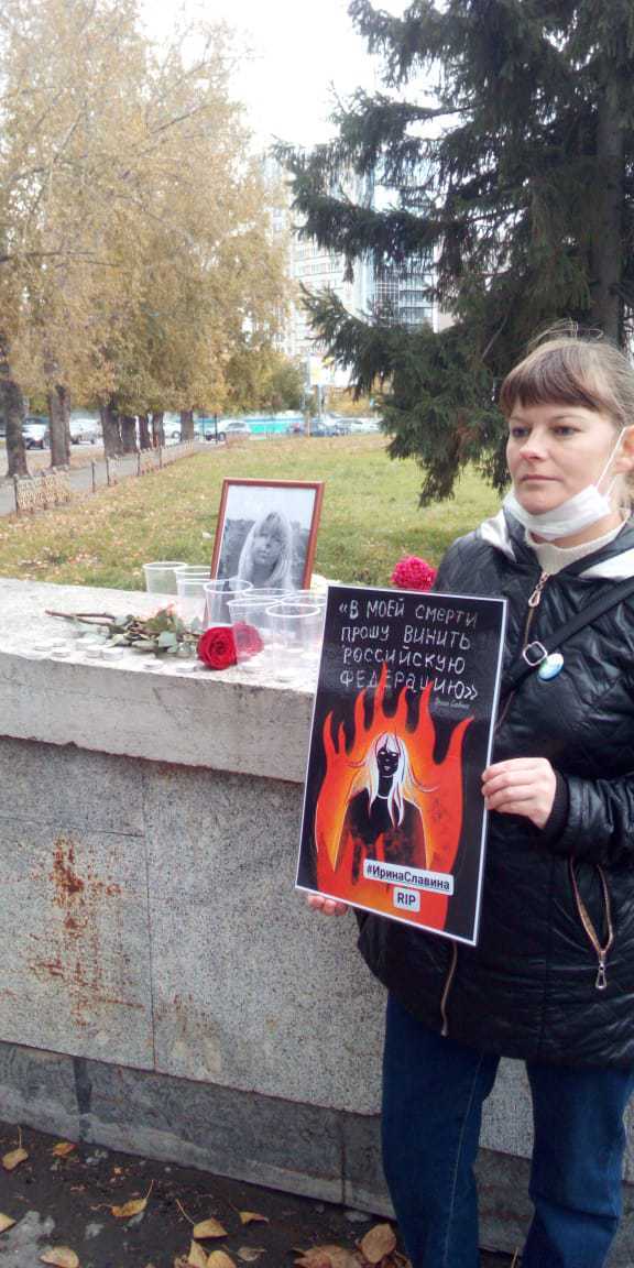 Жители Красноярска и Новосибирска провели акции памяти журналистки Ирины Славиной, совершившей 2 октября акт самосожжения у управления МВД в Нижнем Новгороде после обысков у неё дома. В Красноярске люди вышли к памятнику жертв политических репрессий, в Новосибирске – к зданию регионального МВД. При этом новосибирская полиция настойчиво просила пикетчицу перейти к памятнику погибшим полицейским в соседний сквер, сообщила редакции Сибирь.Реалии активистка Яна Дробноход, устроившая одиночный пикет.