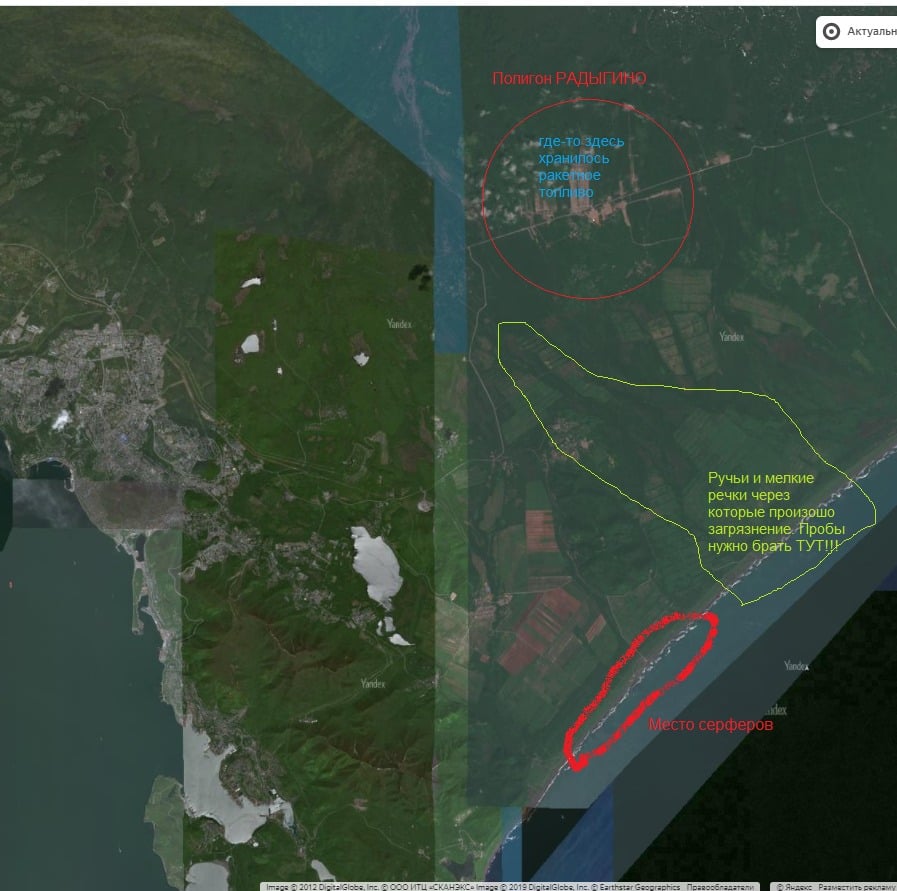UPD. По словам председателя экологического движения "Эковахта" Дмитрия Лисицына, на полигоне Радыгино в 1998 году были размещены на хранение 300 тонн ракетного топлива - самин и меланж. "Это сильные яды, действие которых аналогично симптомам, о которых сообщают сёрферы. На карте показана зона поверхностного стока паводковых вод с этого полигона - они выходят в океан чуть севернее того места, где базируются сёрферы", - пояснил экоактивист редакции Сибирь.Реалии.