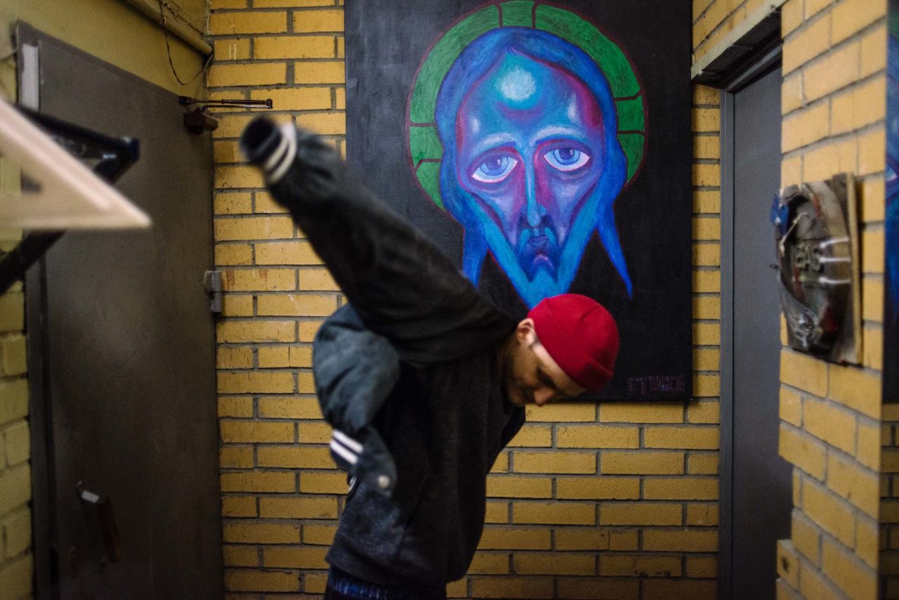 «Я, вообще-то, уже несколько лет не рисую Иисуса», — с этими словами Арсений некрепко жмет мне руку при встрече. Движения у него резкие, отрывистые, а сам — будто весь из углов и ломаных линий. Глаза красивого синего цвета, но чаще всего взгляд он отводит в сторону. Быстрым шагом, как будто куда-то опаздывая, мы идем вдоль трамвайных путей вниз по улице. На ходу Арсений рассказывает, что сейчас очень много работы, что устал и не помнит, когда были выходные, а еще — что недавно крестил сына.