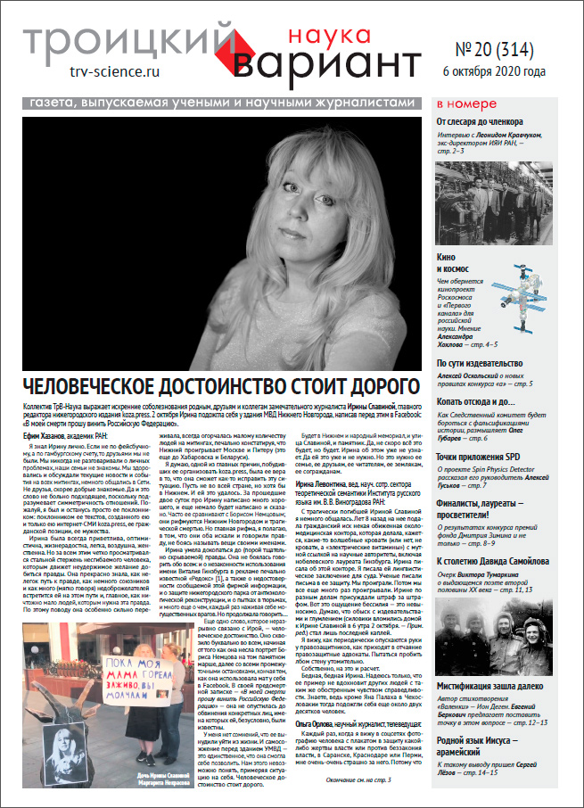 Коллектив ТрВ-Наука выражает искренние соболезнования родным, друзьям и коллегам замечательного журналиста Ирины Славиной, главного редактора нижегородского издания koza.press. 2 октября Ирина подожгла себя у здания МВД Нижнего Новгорода, написав перед этим в Facebook: «В моей смерти прошу винить Российскую Федерацию», — стр. 1, 3