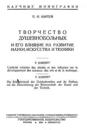П. И. Карпов. Творчество душевнобольных и его влияние на развитие науки, искусства и техники. М.: Государственное издательство, 1926