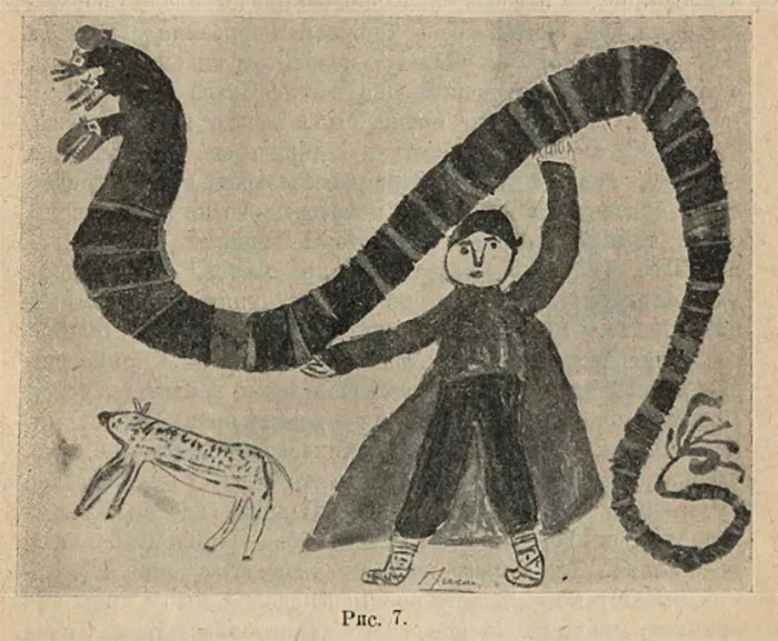 «Стереотипия» может проявляться и не так явственно. Вот, например, рисунок с вполне динамичным сюжетом. Однако стоит обратить внимание на однотипные головы змея и множество колец на его теле.