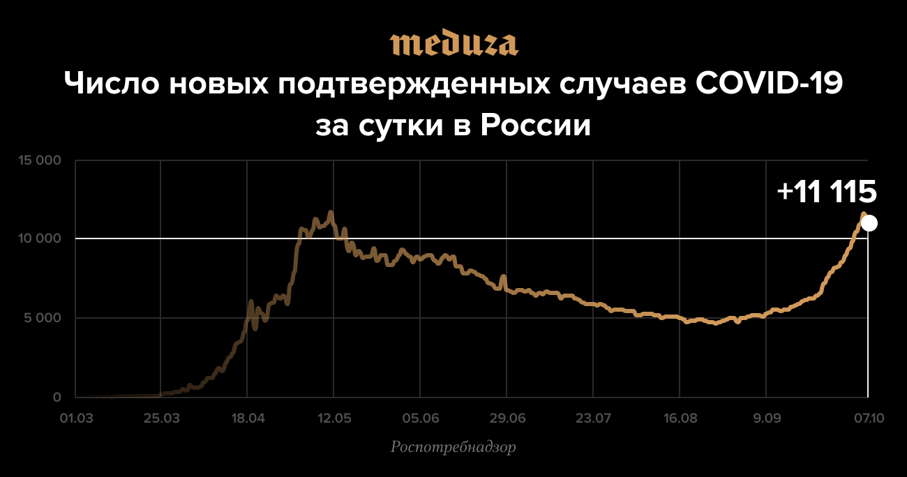В России не случилось абсолютного рекорда по заражениям: за сутки выявили 11 115 новых случаев COVID-19, ровно на 500 меньше чем днем ранее. Впервые с 13 сентября число заболевших не выросло, а снизилось. Особенно резко меньше новых заражений стало в Москве: вчера заболели 4082 человека, сегодня — 3229. Всего с начала пандемии в стране заболели 1 248 619 человек. Кажется, начала расти смертность: за сутки в стране умерли 202 человека — это максимум с 1 июля. В Москве умер 41 человек. Так много не было с 19 июня. За сутки из больниц выписали 6699 пациентов с ковидом. За все время выздоровели 995 275 человек.
