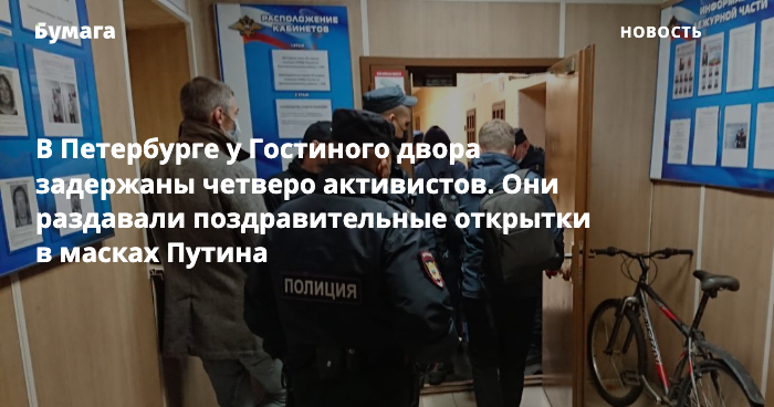В Петербурге у Гостиного двора задержали четверых активистов. Они раздавали поздравительные открытки в масках Владимира Путина. Об этом сообщает «МБХ Медиа».