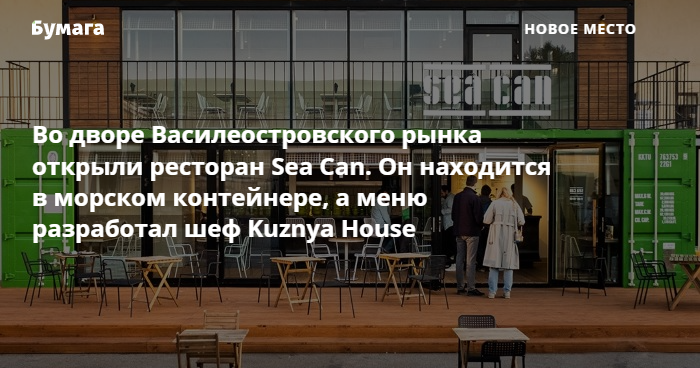Во дворе Василеостровского рынка начал работу ресторан Sea Can, рассказали «Бумаге» представители рынка. Заведение расположено в двухэтажном морском контейнере. Дизайн разработал главный архитектор бюро TSAN Architects Максим Цыбин, айдентику и визуальные эффекты — Василий WTF, креативный директор пивоварни AF Brew.