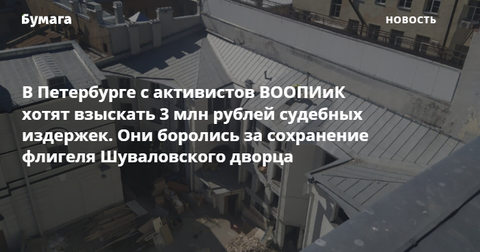 Компания «ГородЪ» подала заявление о взыскании судебных издержек на 3 миллиона рублей к активистам ВООПИиК Александру Кононову и Анне Капитоновой. Об этом сообщила «Фонтанка» со ссылкой на заявление фирмы. Информацию «Бумаге» подтвердила Капитонова.