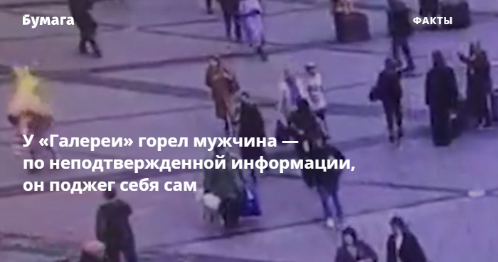 У торгового центра «Галерея» вечером 7 октября горел мужчина, его госпитализировали в тяжелом состоянии. По неподтвержденной информации, он поджег себя сам. В руках у пострадавшего был плакат, но что на нем было написано, не уточняется. «Бумага» рассказывает, что известно о происшествии.