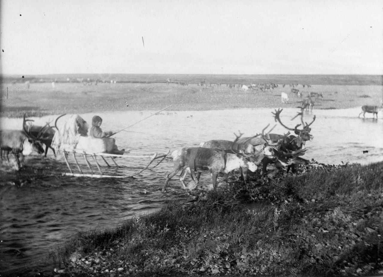 Легкие женские нарты впереди аргиша — оленьего каравана. Перегон Ямал — Салехард, 1950 годФото: архивные фотоматериалы 1930—1940-х годов. Этнографическое собрание М. С. Синицына