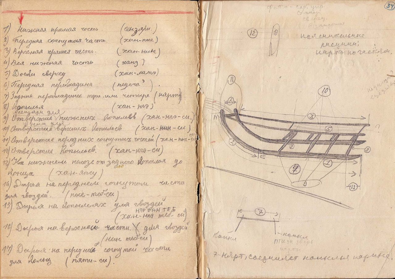 Страницы тетради «Вайгачская № 2» (июль 1949 года) с описанием и рисунком устройства нартыФото: архивные фотоматериалы 1930—1940-х годов. Этнографическое собрание М. С. Синицына