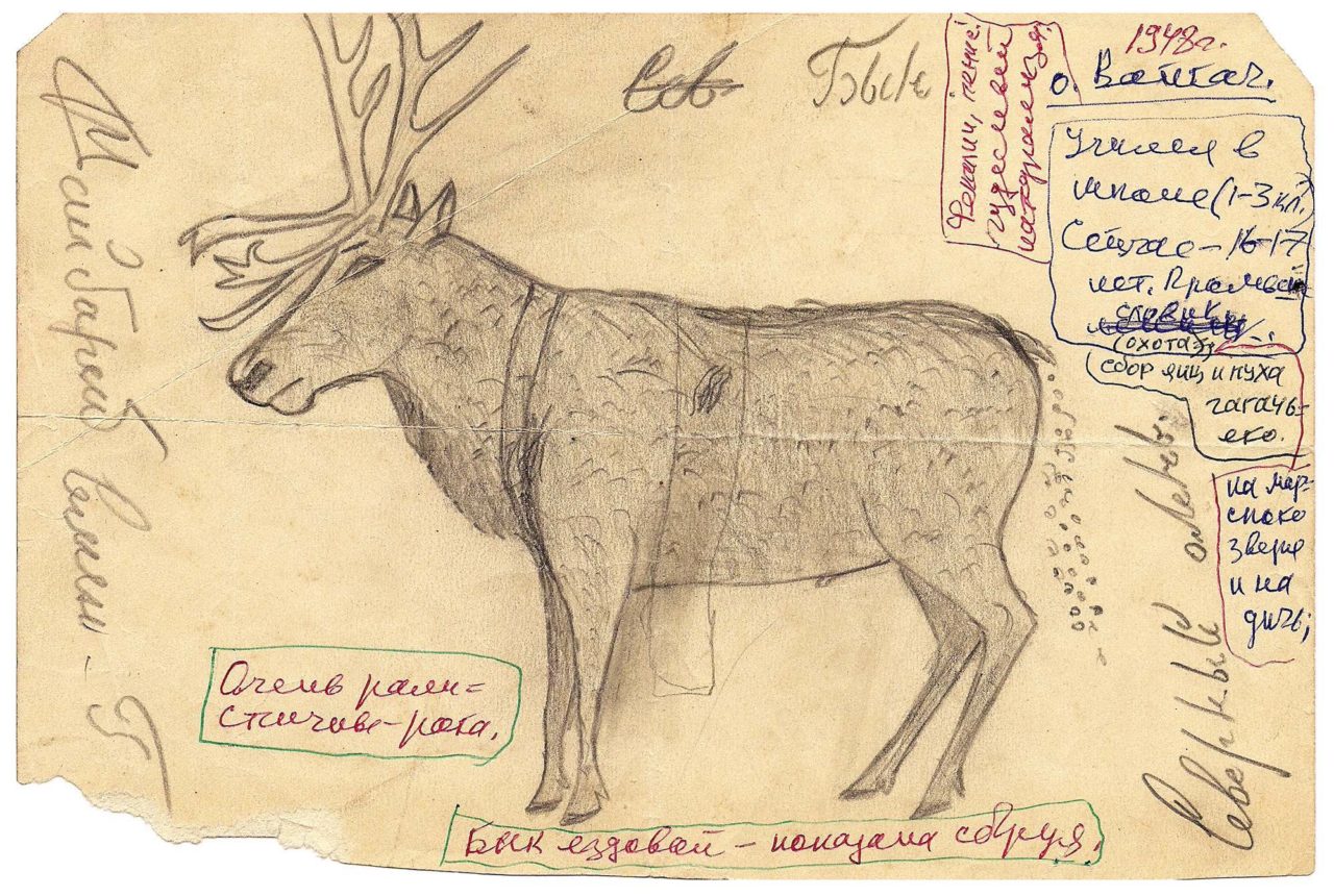 Ездовой олень-бык. Рисунок Семена Тайбарея, приемного сына Нёлёко Вылко. Из собрания М. С. Синицына «Впервые с карандашом». Вайгач, 1949 годФото: архивные фотоматериалы 1930—1940-х годов. Этнографическое собрание М. С. Синицына Главный труженик в чуме — женщина. В ненецком хозяйстве у нее очень много работы. Кроме приготовления пищи и ухода за детьми, она выполняет еще массу других обязанностей. Ненка сушит, затем обрабатывает скребком оленьи шкуры, шьет из них одежду и обувь; изготовляет покрышки для чума, то есть фактически строит дом, что в других местах делает мужчина. В старые времена она вставала раньше всех и тотчас же начинала раздувать огонь дымного очага. Напряженно проработав весь день, она позже других ложилась спать, своими натруженными, исколотыми иголкой руками почти до утра просушивая и починяя снятые мужчинами вещи. <…>