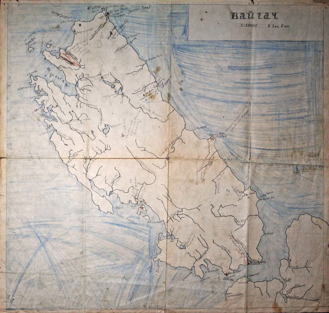 Карта острова Вайгач, нарисованная по памяти ненецким охотником Нямбо Вылко по просьбе М. С. Синицына в конце 1940-х годовФото: архивные фотоматериалы 1930—1940-х годов. Этнографическое собрание М. С. Синицына На Вайгач и Белый, которые в ненецких легендах могут иметь одно название — Сэр-нго, раньше не смела ступать женщина. Достигшая возраста половой зрелости, она считалась существом нечистым и во время молебнов оставалась на Большой земле. Более того, здесь не разрешался выпас оленей, поэтому долгое время острова оставались неприкосновенными. Все здесь принадлежало духам. Заселение Вайгача как раз и началось с оленей, с обильной для них кормовой базы. Пробыв какое-то время на Вайгаче с паломниками, они отъедались, и, в чем уверены тундровые оленеводы, даже цвет их шкуры менялся на более светлый.
