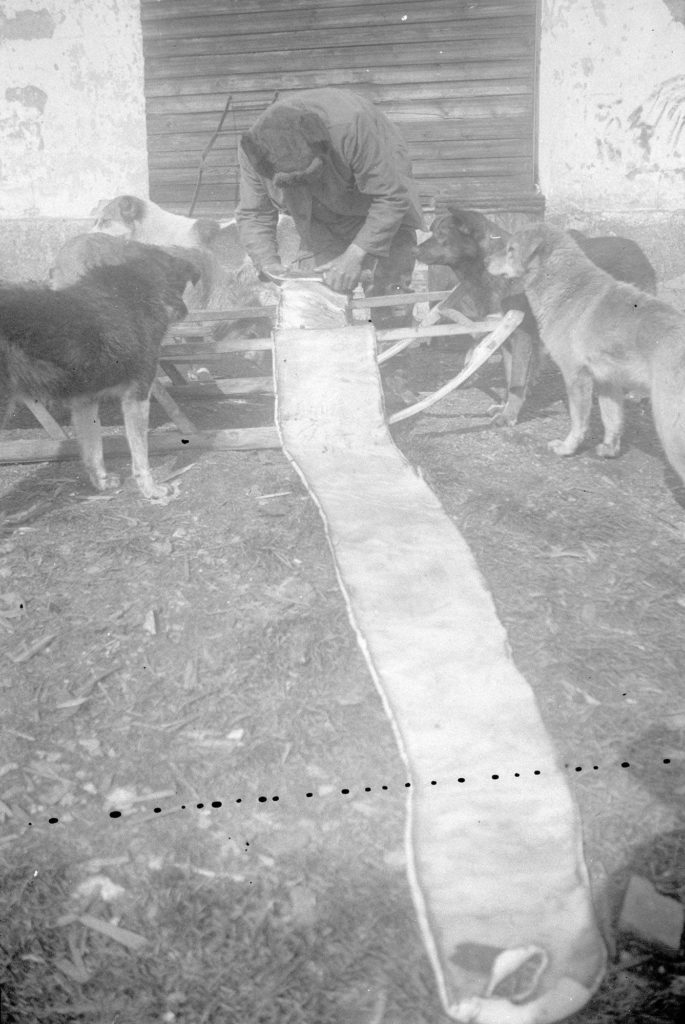 Шкуру кита Нёлёко раскладывает по всей длине и «бреет» на нарте ножом, освобождая от остатков жираФото: архивные фотоматериалы 1930—1940-х годов. Этнографическое собрание М. С. Синицына Весной, когда оголодавшие за зиму олени быстро устают и выбиваются из сил, в нарты запрягают собак. Собачья упряжка является в тундре самым быстрым средством передвижения. <…>