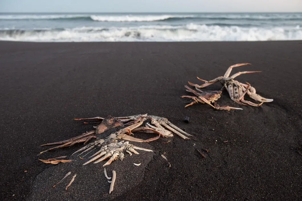 На Халактырском пляже, где изначально заметили загрязнение воды местные серферы, продолжают находить трупы морских обитателей. Активисты также обнаружили там мертвых крабов.