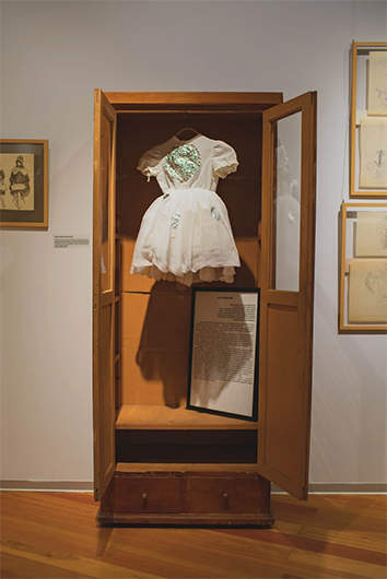 Итак, выставка собрана из близких по теме мемориальных капсул. Многие из них рассказывают о детях (о девочках) 1960-х — 1970-х годов, чьи платья шились и перешивались бабушкой или мамой, а макетировались советской властью. Школьная униформа или костюм снежинки были жесткими ячейками, установочными клише. В редких памятных случаях в эту ячейку проникали крупицы тепла, кустарные доделки, незаметные для постороннего глаза. Видимо, как какой-нибудь вязаный кисет, который солдат носит у сердца. Но если в руках у нас только кисет, позволяет ли он осознать масштаб, смысл и цели войны? И думает ли об этом сам солдат?