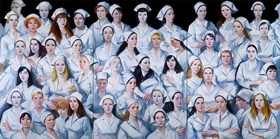 © Gridchinhall Gallery Наташа Иванова. Медсестры Пятиметровое панно должно было отсылать к цеховым портретам XVII века, но ассоциируется оно, скорее, с молодежными муралями семидесятых годов. Одно отличие: в модернистских композициях всегда есть гендерное напряжение, мужчины и женщины строят новый мир, дополняя друг друга. Здесь — утопия чувствительности без конца и края: армия идеальных двадцатилетних смотрит на зрителя, как спокойные мадонны, вежливые дочери-сиделки, готовые выслушать и вылечить каждого, кто запер свои эмоции в черный ящик. В резком свете космической темы медицинская метафора оказалась заметно глубже, чем многие образы героев пандемии, но на выставке три поколения так и не встретились: слишком большой холст в Калугу привезти не получилось.