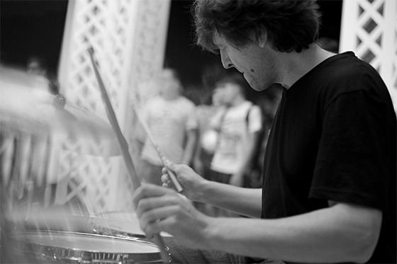 Отоцкий: Но вообще барабаны — это очень эротический объект. Если поставить установку в любое место — она сразу изменит пространство вокруг, как и рояль: это арт-объекты. Мне в разных составах доводилось играть на подземной парковке, на скале у кромки моря под Генуей, в шаре посреди леса под Дубной.