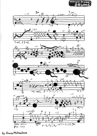 Анна Михайлова: Существует традиционная музыкальная нотация — она довольно четкая. Состоит из тактов, повторений и прочего. Я просто подошла к этому вопросу с другой стороны. Если взять общую канву настройки, то партитура — это вход к разговору с ударной установкой. То есть кресты — это лид, железо, тарелки и стенды, а кружочки — это скин, то есть кожа, поверхность барабана, хоть голая, хоть поверхность живота. И момент расстояния от себя до инструмента — то есть между тем, как ты слышишь звук, и тем, как он звучит на самом деле. Потому что партитура — это некая секунда в твоей настройке, когда ты играешь. Вообще эта пьеса в идеале для сорока установок.