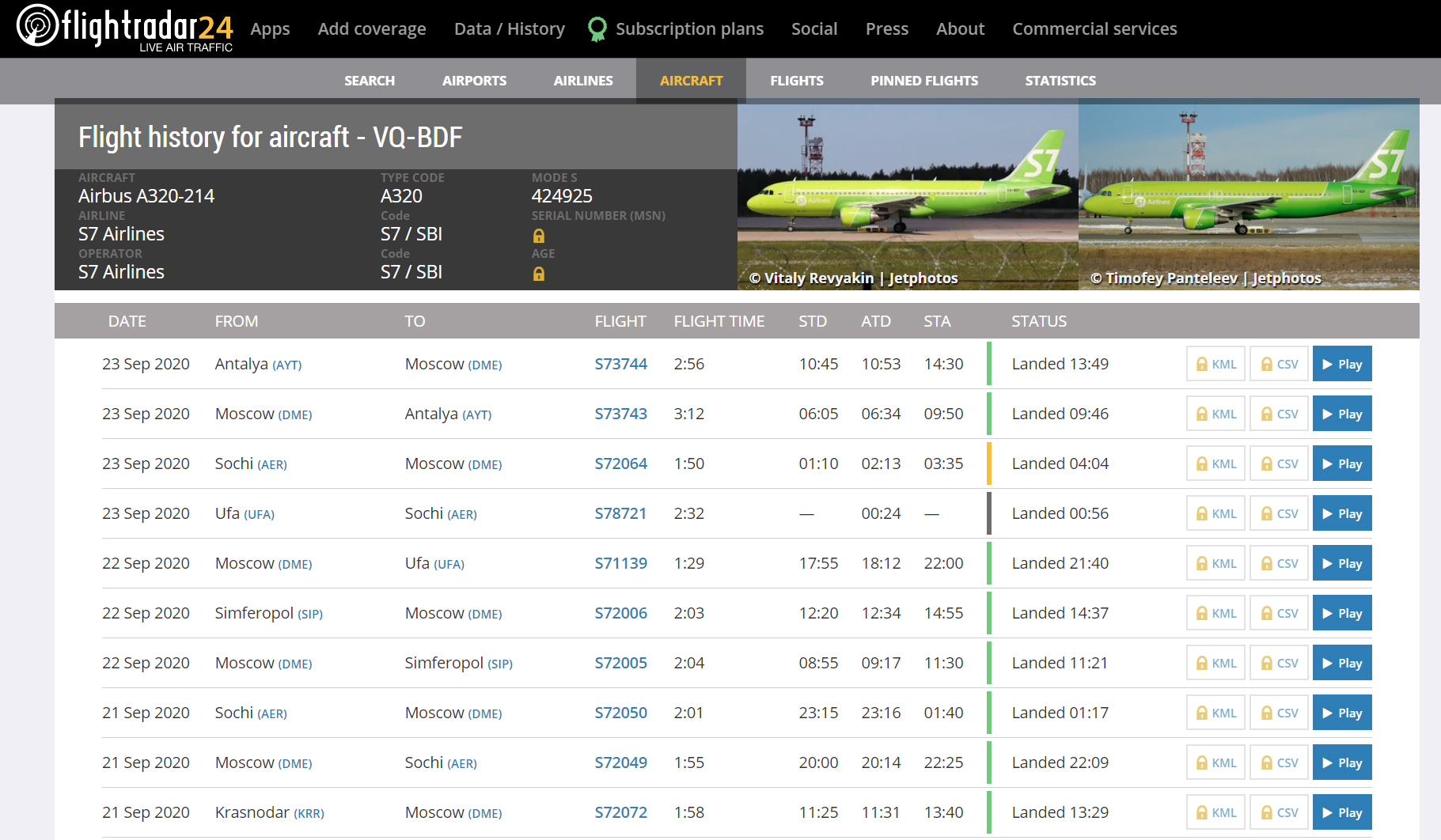 Борта, попавшие под арест, летают в аннексированный Крым и сейчас. Более того, некоторые мы зафиксировали и за рубежом. К примеру, Airbus A-320 с бортовым номером VQ-BDF авиакомпании «S7 Airlines» 22 марта 2020 года улетел из Симферополя в Москву, оттуда в Уфу, затем в Сочи и уже 23 марта самолет оказался в турецкой Анталии.