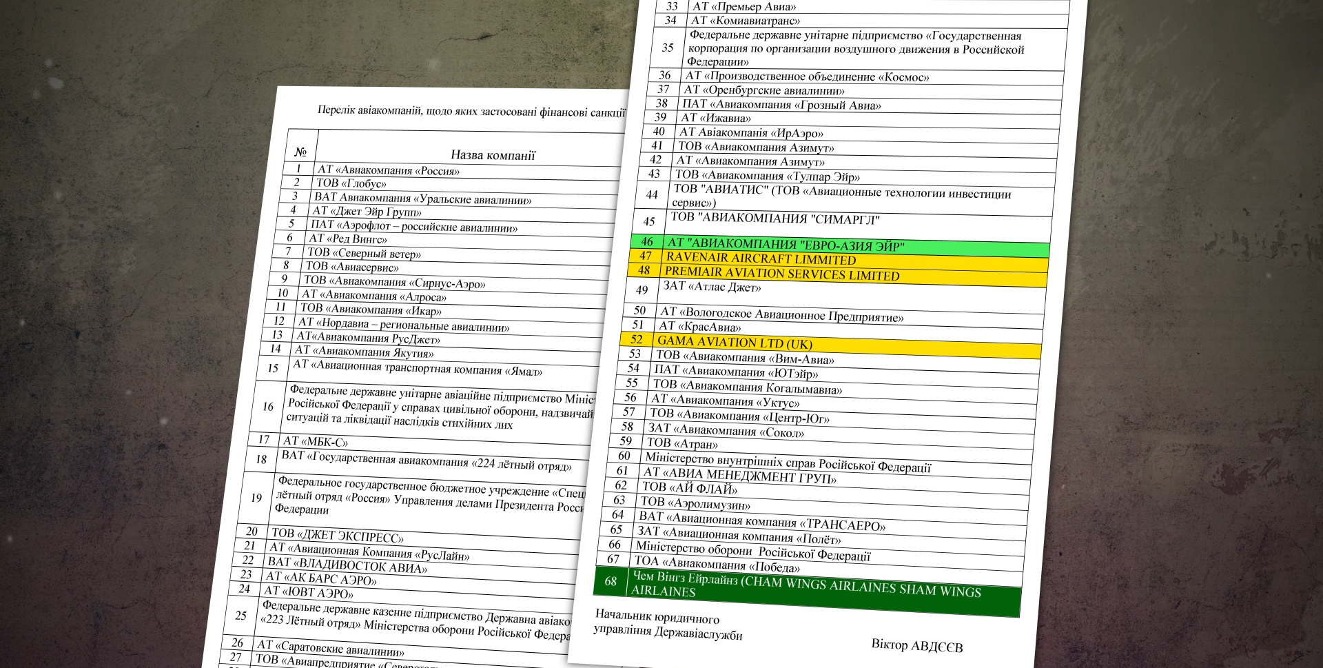 Никита Панасенко успел изучить некоторые из этих документов еще до того, как закрыли к ним доступ. Он насчитал 37 российских авиакомпаний, чьи самолеты попали в эти постановления, среди них: АО «Авиакомпания «Россия», ООО «Глобус», ОАО АК «Уральские авиалинии», ПАО «Аэрофлот – российские авиалинии», АО «Ред Вингс», АО «Авиационная компания «Руслайн», ООО «Джет Экспресс», ООО «Северный ветер», АО «Авиакомпания Якутия», ООО «Газпром-авиа».