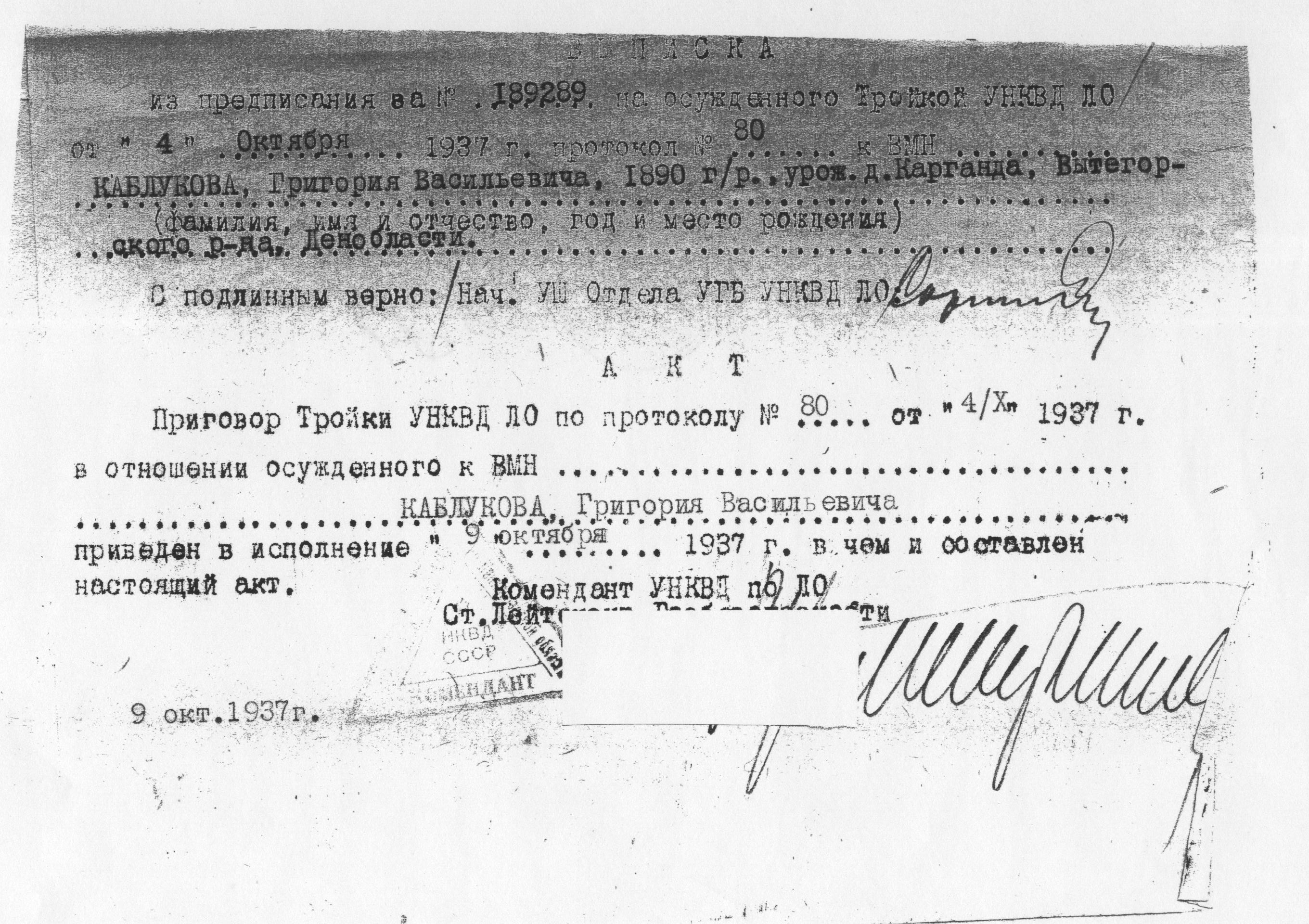 Григорий Васильевич Каблуков даже не был верующим, что не помешало расстрелять его вместе с горицкими монахинями. И кулаком тоже не был, хотя в материалах дела он и назван "кулаком-торговцем". В 1990-х годах делом Григория Каблукова занялся его правнук Анатолий Сычев из Вологды. О трагедии он узнал от бабушки Елены, хотя она о своем расстрелянном отце рассказывала немного. Другие родственники считали Григория Каблукова деловым человеком. Он родился в 1890 году в деревне Карганда Вытегорского района, в 1914-м ушел на Первую мировую, но в деревню уже не вернулся, жил в городе Белозерске, работал багермейстером – плавал на земснаряде, руководил земляными работами на Мариинской водной системе. После революции эта работа остановилась, надо было искать другие источники существования – и он не растерялся, в 1920-х годах стал нэпманом, завел шорную мастерскую-магазин, где изготавливал конную упряжь и там же ее продавал. Это ему даром не прошло – в 1929 году его объявили спекулянтом и приговорили к трем годам ссылки с конфискацией имущества, сворачивая НЭП, "свернули" и маленькое дело Каблукова.