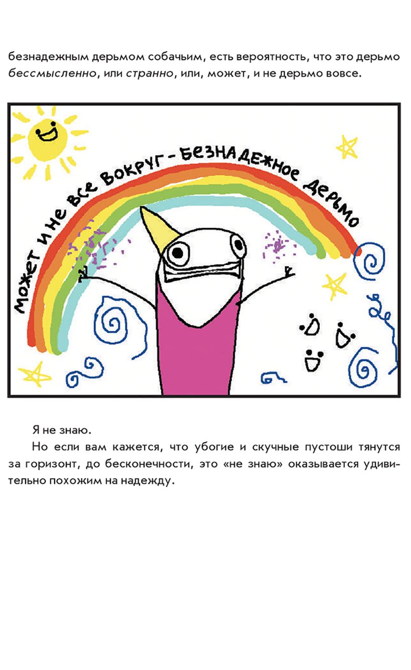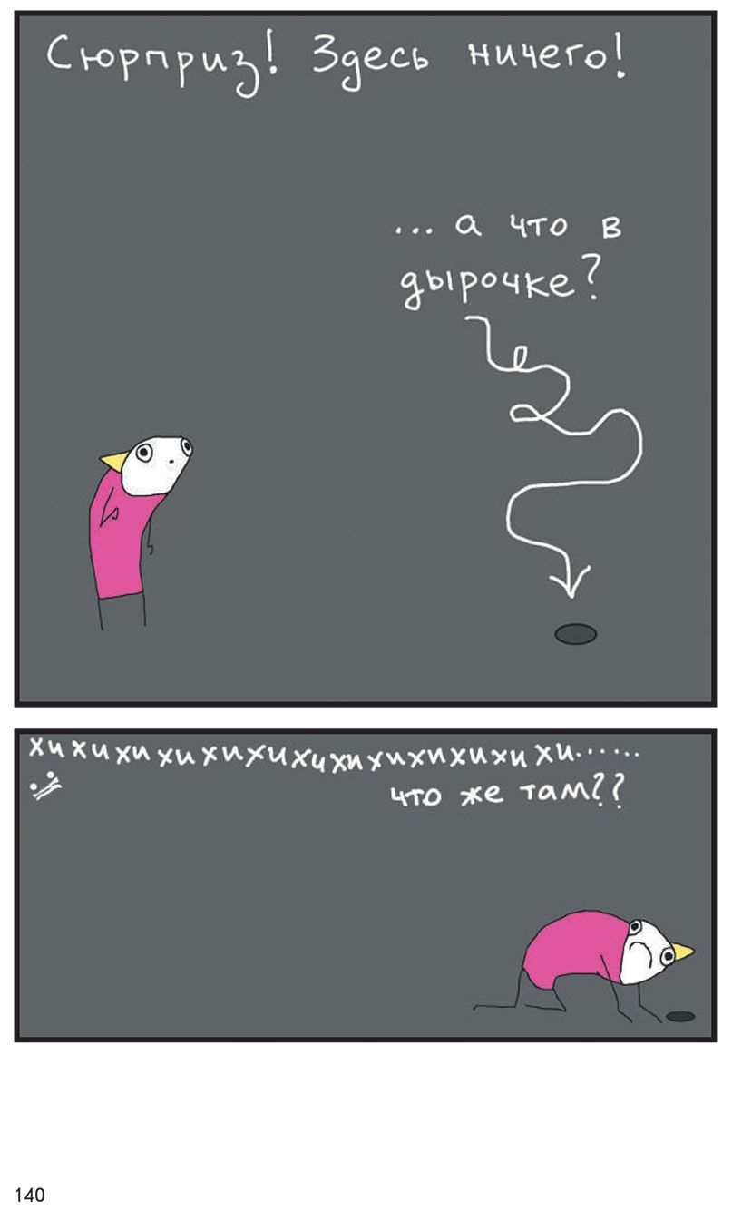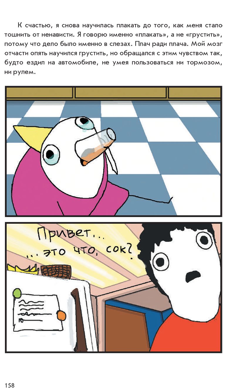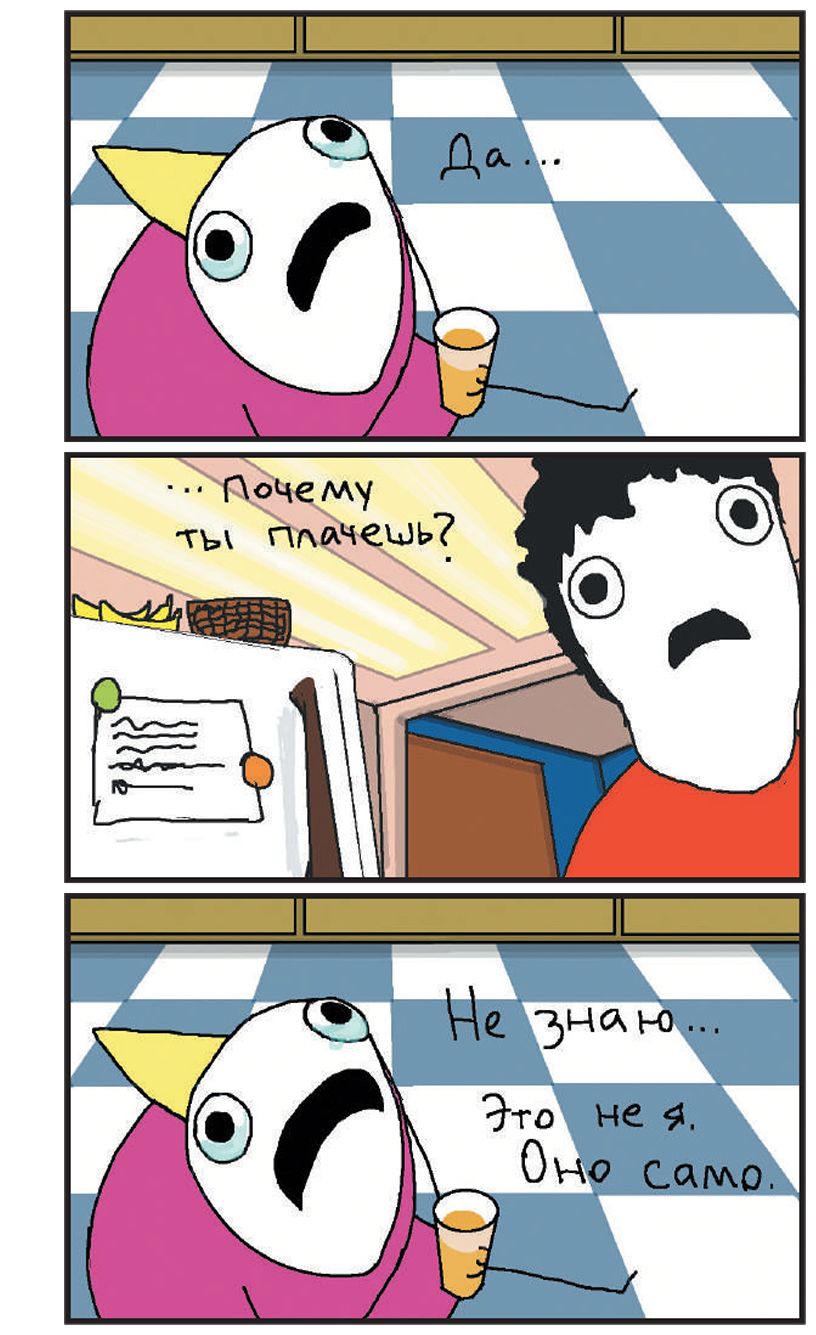 В конце октября 2020 года в издательстве «Лайвбук» выходит книга «Гипербола с половиной» (перевод Дарьи Ивановской). Это сборник историй художницы Элли Брош — автора иллюстраций к популярному в России мему «Кто мы? Чего мы хотим?». «Медуза» публикует вторую из двух глав книги, посвященных депрессии.