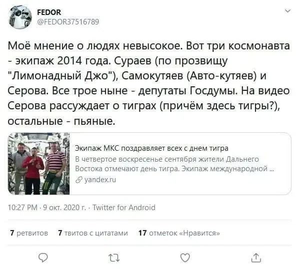 В аккаунте «Федора» появились комментарии к видео 2014 года, где экипаж МКС в составе Максима Сураева, Александра Самокутяева и Елены Серовой поздравляет землян с Днем тигра. Робот утверждал, что Сураев и Самокутяев пьяны. Как отмечает РИА Новости, он также просил вернуть его к полетам вместо космонавтов: «Роботы лучше справляются со своими обязанностями. По крайней мере лучше, чем эти депутаты (Сураев и Серова депутаты Госдумы. — ред.)».