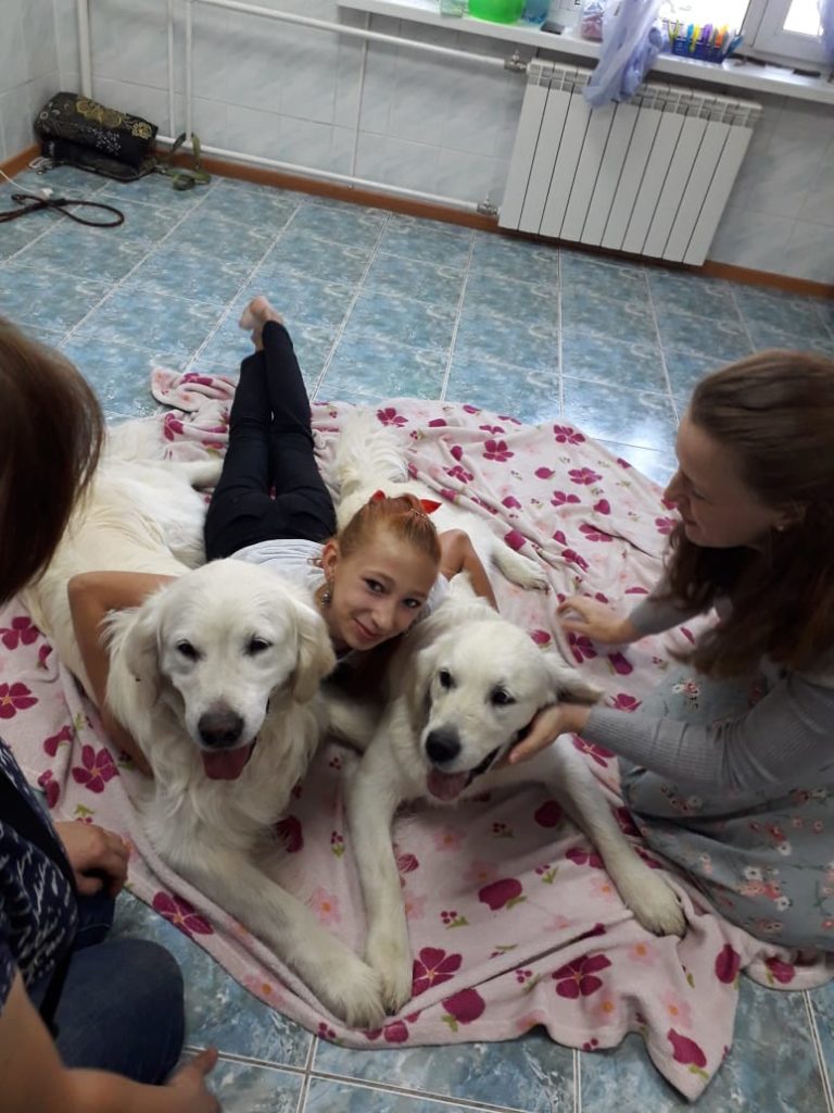 Сегодня в «Доктор пес» помимо Елены работают два канистерапевта — Ольга и Юлия, а также четыре собаки: голден-ретриверы Лаки и Умка, немецкий боксер Мира и лабрадор Ника.