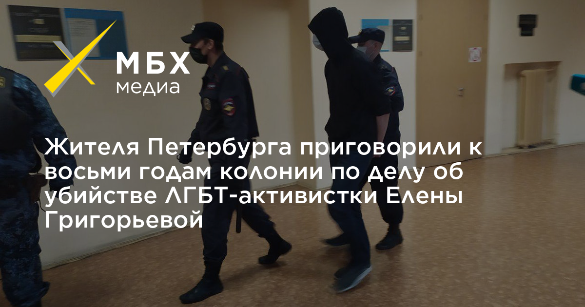 Московский районный суд Петербурга приговорил местного жителя Алексея Волнянко к восьми годам и одному месяцу колонии строгого режима по делу об убийстве ЛГБТ-активистки Елены Григорьевой. Об этом сообщает корреспондент «Северо-Запад. МБХ медиа».