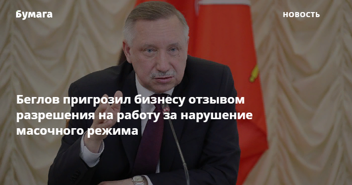 Беглов заявил, что за несоблюдение масочного режима на предприятиях бизнесу грозят санкции вплоть до отзыва разрешений на работу в условиях эпидемии. В особенности это касается сферы оказания «контактных» услуг, добавил губернатор.