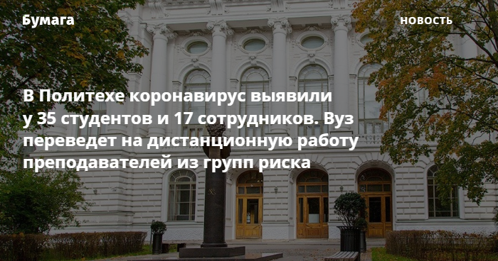 В Политехе коронавирус подтвержден у 35 студентов и 17 сотрудников, в том числе у девяти преподавателей. Об этом рассказал ректор СПбПУ Андрей Рудской в своем обращении на сайте вуза.