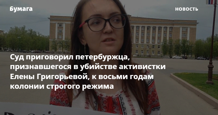 Московский районный суд приговорил петербуржца Алексея Волнянко к восьми годам и одному месяцу колонии строгого режима по делу об убийстве активистки Елены Григорьевой (ч. 1 ст. 105 УК РФ).