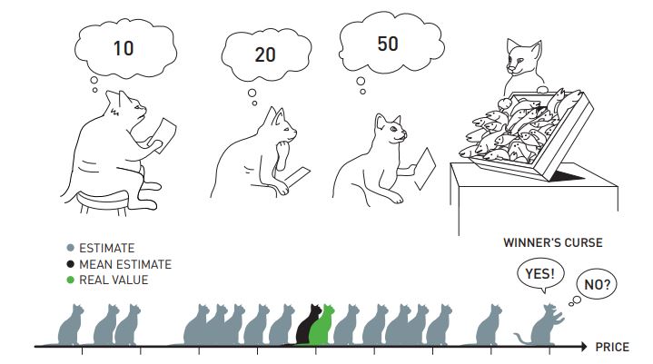 - Самый простой пример — «проклятие победителя»: тот, кто предложил самую высокую цену на стандартном «английском аукционе» (когда все выкрикивают более высокие цены), почти наверняка переоценил объект. Нобелевский комитет иллюстрирует этот закон так: