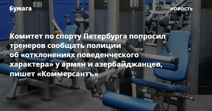 Комитет по физической культуре и спорту Петербурга разослал в подведомственные учреждения просьбу выявлять лиц армянской и азербайджанской национальностей, изучать их отношения и докладывать в МВД об «отклонениях поведенческого характера, способных привести к межнациональным конфликтам». Об этом сообщил «Коммерсантъ» со ссылкой на документ.