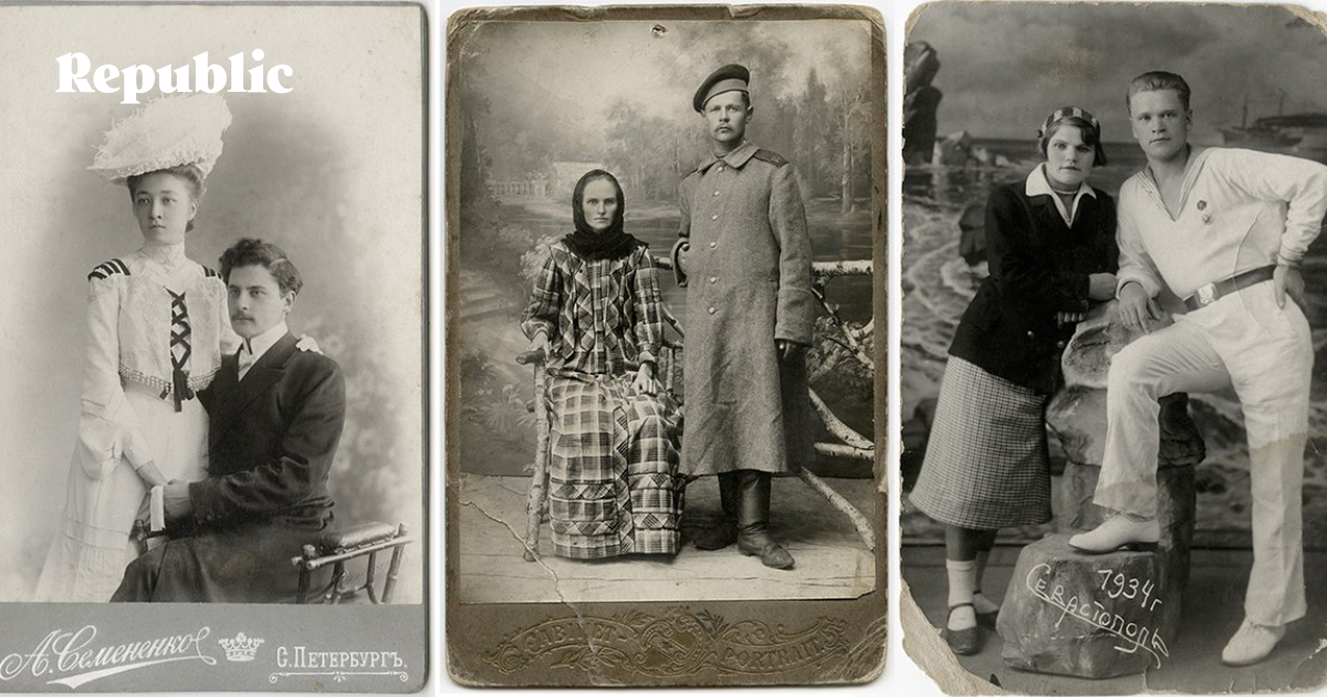 У моей сестры в детстве была плоская односторонняя кукла из картона. К кукле в киосках Союзпечати покупались листы с нарядами. Наряды нужно было вырезать вместе с белыми лямочками, которые загибались за спину кукле, чтобы одежки не спадали. В 90-х на смену картонной кукле пришли Барби и ее друг Кен. Сегодняшняя подборка – русский парный портрет – похожа на переодевание русских Кена и Барби в исторические костюмы. С той лишь разницей, что за 80 лет – я взял отрезок с 1865 по 1945 год – изменились не только костюмы и прически, изменились и сами люди.