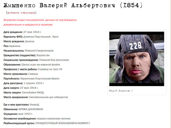 © Сергей Бондаренко Это «Бессмертный барак» наоборот: все, кого вы считаете пострадавшими, на самом деле преступники. Страницами с «членом СС» или «бойцом УПА» подтверждается старый тезис о том, что «либералы в этой стране кого угодно сделают жертвой репрессий». Список размывается и дискредитируется. Вы никогда не сможете оплакивать вашего прадедушку со спокойной совестью, если на соседней с ним странице прячется Адольф Гитлер.