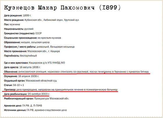 © Сергей Бондаренко Из рабочего архива «Открытого списка», материалы следственного дела Или, по словам односельчан, «поселил немцев у себя дома», когда они оккупировали его деревню? А того, кто провел в заключении, допустим, неделю, а затем был отпущен, так как политическое обвинение не подтвердилось? Вывод ничем не отличается от предыдущего — «с такими жертвами и враги не нужны».