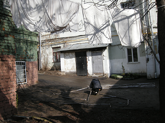 © Наталья Смолянская Первая выставка-акция 1 мая 2015 года в Подколокольном переулке, куратор Дима ФилипповРабота Ильи Романова Постепенно, начиная с революционного прорыва авангарда, в качестве искусства понимается не только и не столько произведение, сведенное к живописи или скульптуре (или впоследствии — к объекту), сколько весь контекст, создаваемый художником. Поворот происходит в шестидесятых годах, когда на выставке показывают перформансы, как это было, например, в Judson Gallery в Нью-Йорке, где все началось с энвайронментов Класа Олденбурга «Улица» и Джима Дайна «Дом», где сами выставленные предметы не имели уже особой ценности, а художественное выражение обретало смысл в общей ситуации, создаваемой в этом пространстве. А еще в пятидесятые годы возникают радикальные художественные направления в Японии, и выставки Outdoor в парке Асия группы «Гутаи» были вписаны в пространство парка.