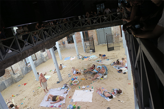 © Наталья Смолянская «Солнце и море, Марина». Выставка в Литовском павильоне. 58-я Венецианская биеннале (приз «Золотой лев»)Места зрителей и перформанса разделены по уровням, зрители находятся на балконе наверху Выставки могут действовать с помощью комплексных высказываний, где важно само место действия и обозначено особо место зрителя, а в других случаях зритель становится собеседником художника и соучастником. Среди таких выставок, например, «Солнце и море. Марина» в павильоне Литвы на Венецианской биеннале 2019 года. Группа «Место искусства» предложила трем исследователям поразмышлять о том, как современные выставки говорят о важных проблемах современности, как связаны между собой их темы, содержание и способы их выражения. Так получилась небольшая конференция, проведенная в июне этого года в формате Zoom [2]. Три участника рассказали о своих исследованиях и/или выставках, которые они организовали: Соня Лау, независимый куратор и культурный продюсер из Берлина, Николя Одюро, куратор и исследователь, который до недавнего времени руководил проектами в Центре искусства в Сен-Фоне (Франция), и Наталья Приходько, независимый исследователь и аспирантка Высшей школы социальных наук в Париже. Встречи показывают, как работают современные исследователи, действующие на стыке теории и практики: именно об этом и говорилось на круглом столе, модерируемом куратором Анной Журбой.