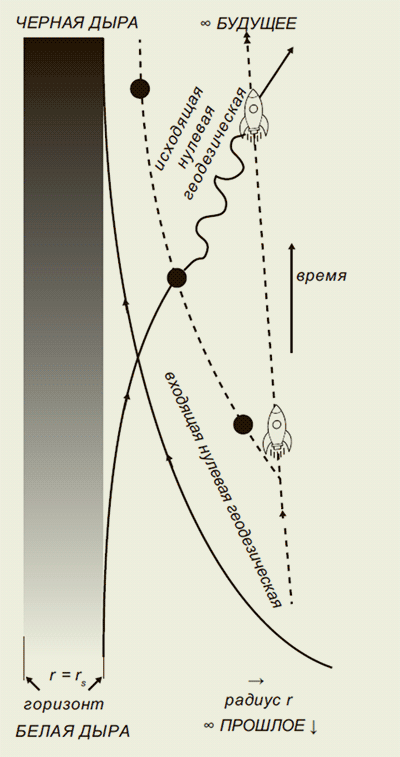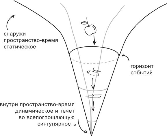 «Как только зонд пересек уровень горизонта, фотонам, испускаемым мигалкой зонда, не остается ничего, кроме как падать к центру дыры. И когда мы говорим, что замедление времени стало „больше бесконечного”, мы понимаем под этим, что время внутри черной дыры совершенно не такое, как время снаружи: оно „идет внутрь”, а будущее внутри черной дыры ограничено сингулярностью».