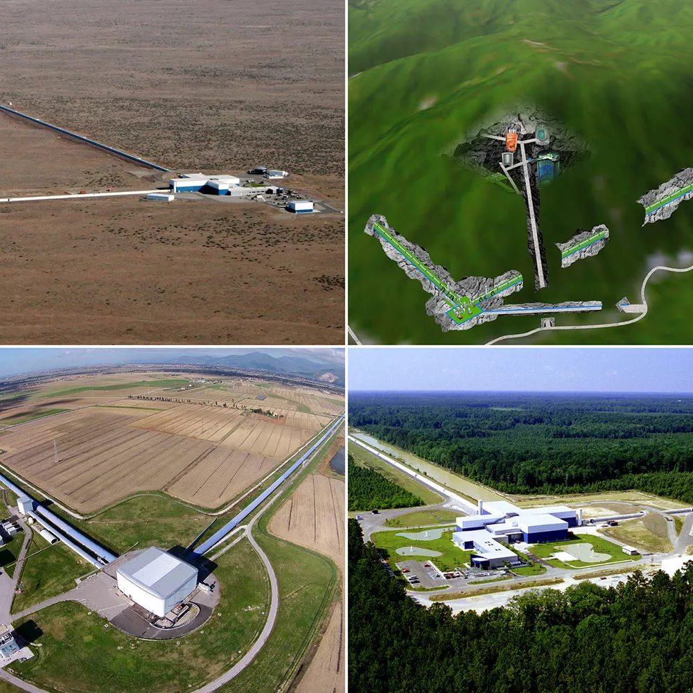 LIGO — это линейка точностью в 1/10 000 диаметра протона. Одно плечо детектора тянется на 4 километра, отклоняясь на несколько градусов к востоку от направления строго на юг по мере удаления от центрального узла. Другое — на 4 километра под прямым углом к первому, отклоняясь на несколько градусов на юг от направления строго на запад. Детекторы фиксируют изменения разности расстояний вдоль двух плеч.