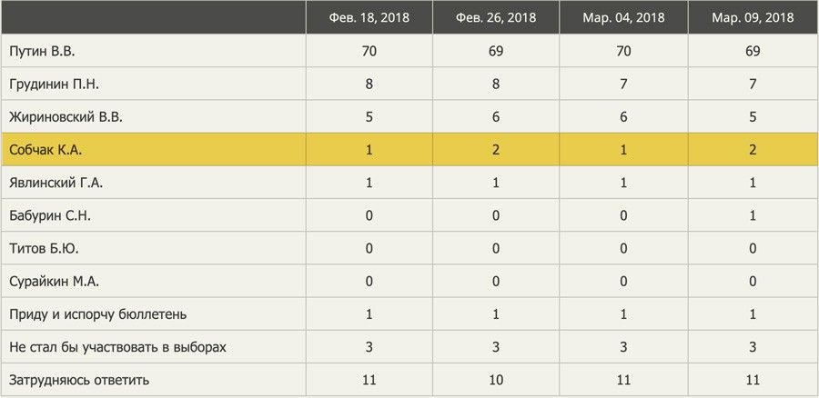 Результат, который Собчак показала на выборах, — 1,68% голосов — показался чересчур ничтожным даже администрации президента, и так делавшей ставку на проигрыш Собчак , говорит кремлевский чиновник. Сама Собчак признается, что результат расстроил и ее, но во всем винит Алексея Навального, который, по ее мнению, «почему-то не захотел проводить умного голосования и объединиться вокруг одного самого либерального из представленных кандидатов»