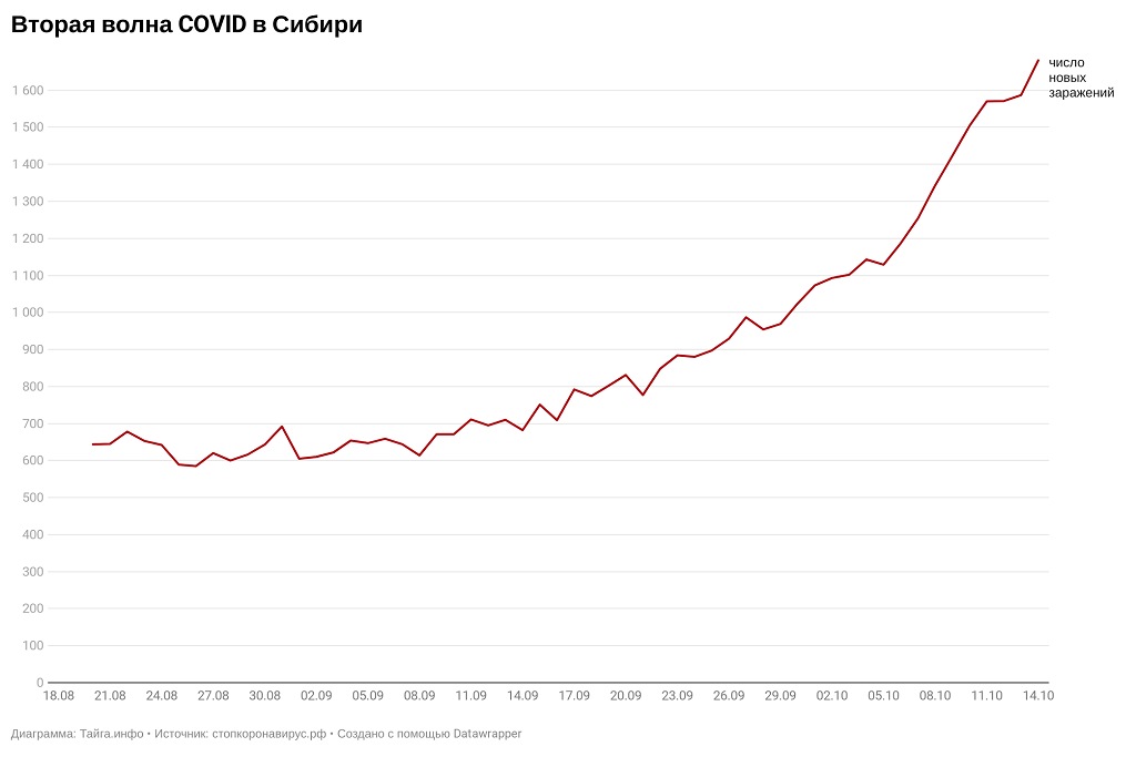 Месяцем ранее — 14 октября — в Сибири было зафиксировано только 682 новых случая коронавируса. За это время заболеваемость выросла почти в 2,5 раза.