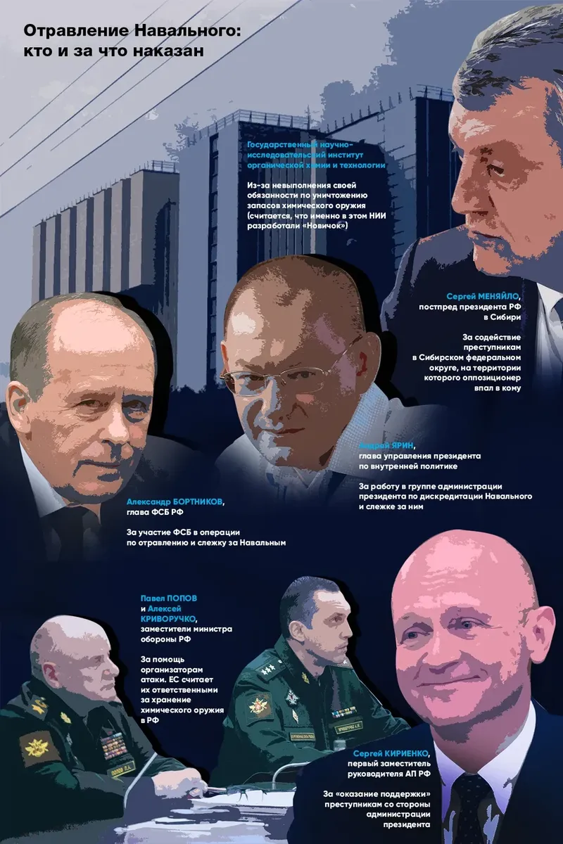 В список вошли директор ФСБ Александр Бортников, первый замглавы администрации президента РФ Сергей Кириенко, начальник управления президента по внутренней политике Андрей Ярин, полпред в Сибири Сергей Меняйло и заместители министра обороны Павел Попов и Алексей Криворучко. Также ограничения коснутся Государственного научно-исследовательского института органической химии и технологии (ФГУП ГосНИИОХТ), причастного, по данным авторов проекта закона, к созданию «Новичка». Список тот же, что фигурировал в утечке, опубликованной накануне в «Нью-Йорк Таймс».