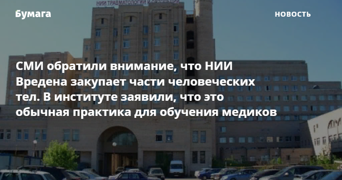 Днем 15 октября десятки региональных и федеральных СМИ обратили внимание на то, что петербургский НИИ травматологии и ортопедии имени Вредена объявил тендер на закупку человечески торсов, ног и рук. Позже директор института заявил, что это обычная практика для обучения медиков-хирургов.