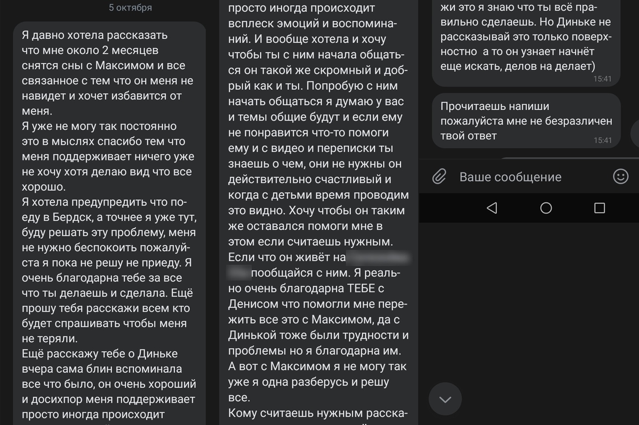 Через пару минут после звонка Кристине пришло странное сообщение: Виктория путано писала про сон, в котором ей привиделся бывший молодой человек Максим — они расстались примерно в то же время, когда Виктория познакомилась с Денисом Калининым — и во сне было понятно, что Максим хочет «избавиться» от нее, поэтому ей надо ехать в Бердск и «решать эту проблему».