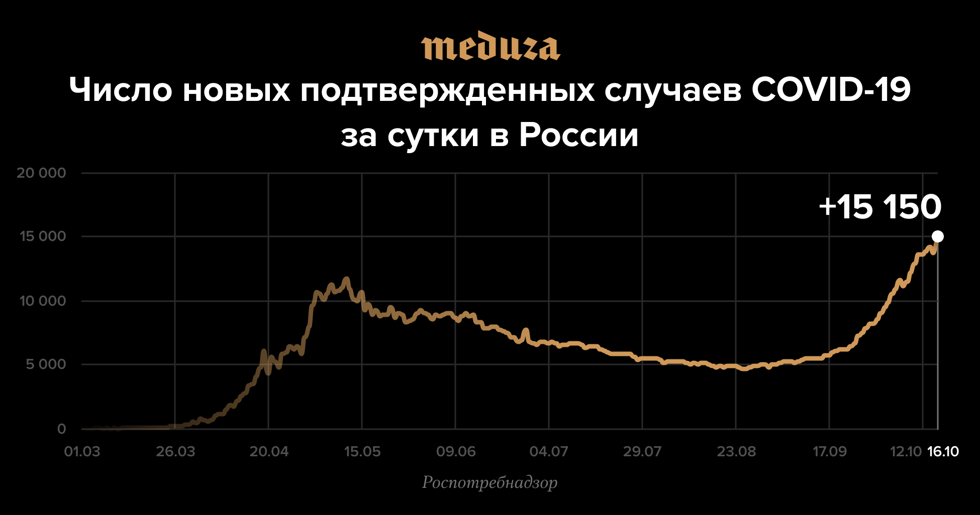 Впервые с начала пандемии в России за сутки выявили более 15 тысяч новых случаев COVID-19 — заразились 15 150 человек. Всего с начала пандемии в стране заболели 1 369 313 человек. За сутки из больниц выписали 8485 пациентов с ковидом. За все время выздоровели 1 056 582 человека. За сутки умерли 232 человека, всего — 23 723 человека.