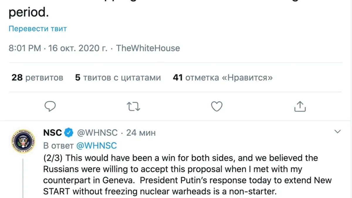 Белый дом в своем официальном аккаунте в твиттере назвал преложение Путина «обреченным на провал» и заявил, что согласится на продление договора, если обе стороны заморозят ядерное оружие на период действия соглашения.