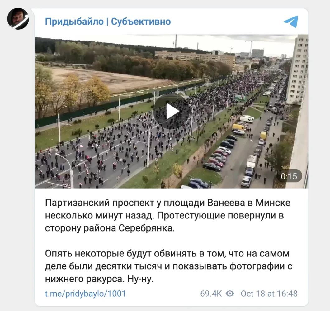 Но ладно, допустим, не со зла поверили российские пропагандисты милиции. Проверять информацию не стали. Но разве можно на этом остановиться? И вот уже RT публикует пост своего корреспондента Константина Придыбайло, который снимает демонстрацию с площади Ванеева: к тому моменту на акции остается от силы четверть протестующих. «Партизанский проспект несколько минут назад. Протестующие повернули в сторону района Серебрянка. Опять некоторые будут обвинять, что на самом деле были десятки тысяч и показывать фотографии с нижнего ракурса. Ну-ну».